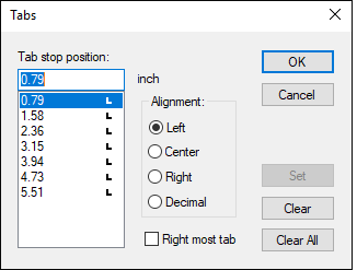 To set up tabulation of text sheets in regular report, use the Tabs dialog box.