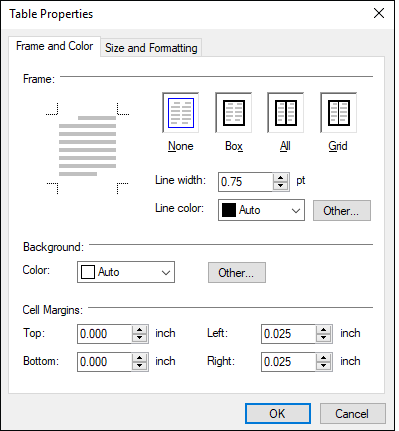 Frame and grid lines. A table frame presents external vertical and horizontal table borders. A table grid presents internal vertical and horizontal borders between table cells.