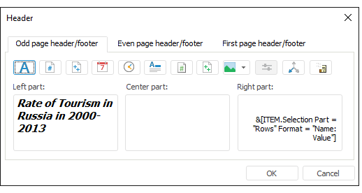 Therefore, report name is displayed in the left part of the header. If required, set up text format, for this click the
