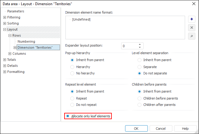 Select the Territories dimension and select the Allocate only Leaf Elements checkbox for this dimension: