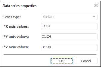 For series of all types, the fields containing the axis values are required. All the settings are entered as ranges.