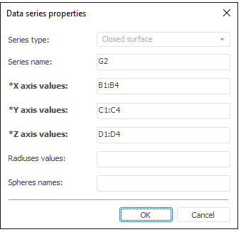 The Data Series Properties dialog box opens on adding or editing 3D scene data sources. Dialog box appearance depends on the selected series type.