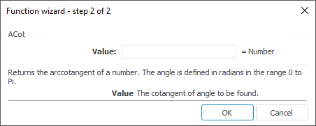 The arccotangent of a number is the angle the cotangent of which is equal to the number. The angle is specified in radians between 0 and Pi value.