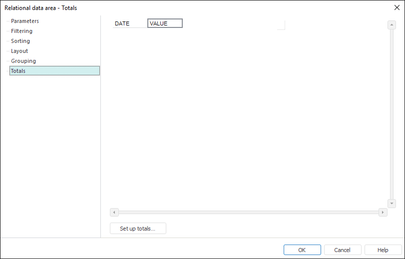 To set up relational data area totals, go to the Totals tab of the Relational Data Area dialog box: