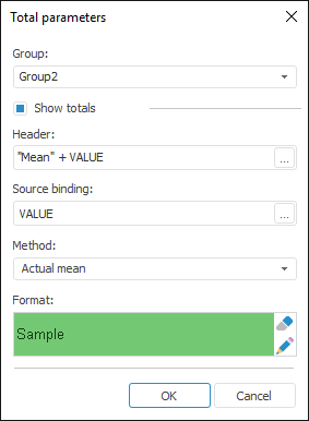 Go to the Totals tab. Select the cell that corresponds to table values (VALUE), and click the Set Up Totals button. The Total Parameters dialog box opens:
