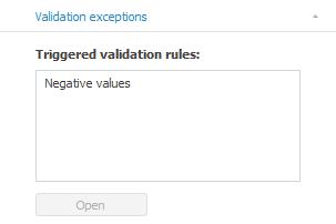Exceptions are displayed in the validation execution area, if validation rule was executed in the express report, dashboard, regular report, on the current sheet of workbook or in the current workbook.