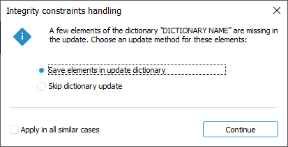 When a table or MDM dictionary is updated and the updated object contains elements or records that are missing in the update, a dialog box may open where the user should select the required option: