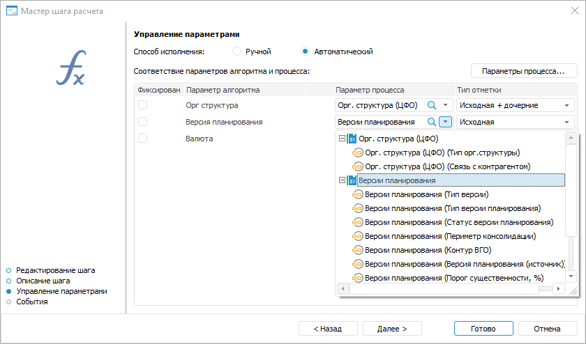 В приведенном примере алгоритм расчёта будет запускаться с фиксированным значением параметра «Версия планирования»: «Годовой план 2018». Для фиксированных значений параметра тип отметки не выбирается.