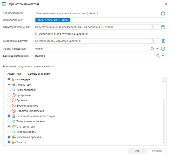 Структура хранения. Для инвестиционных показателей по умолчанию установлен флаг «Индивидуальная структура хранения» без возможности снятия. В этом случае, для показателя создаётся отдельная структура хранения, которая не будет использоваться для других показателей. Если создаётся показатель другого типа, например, базовый, то доступен выбор структуры хранения из списка.