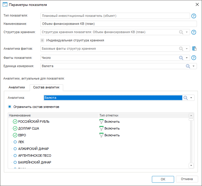Флаг «Ограничить состав аналитик». При включении флага выводится перечень всех элементов аналитики.