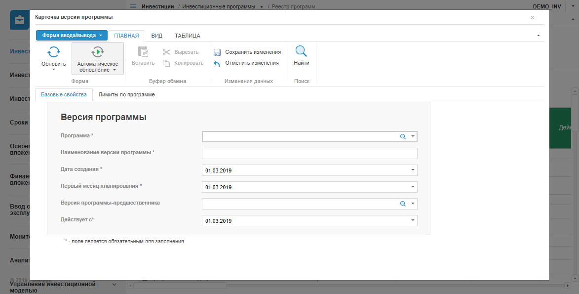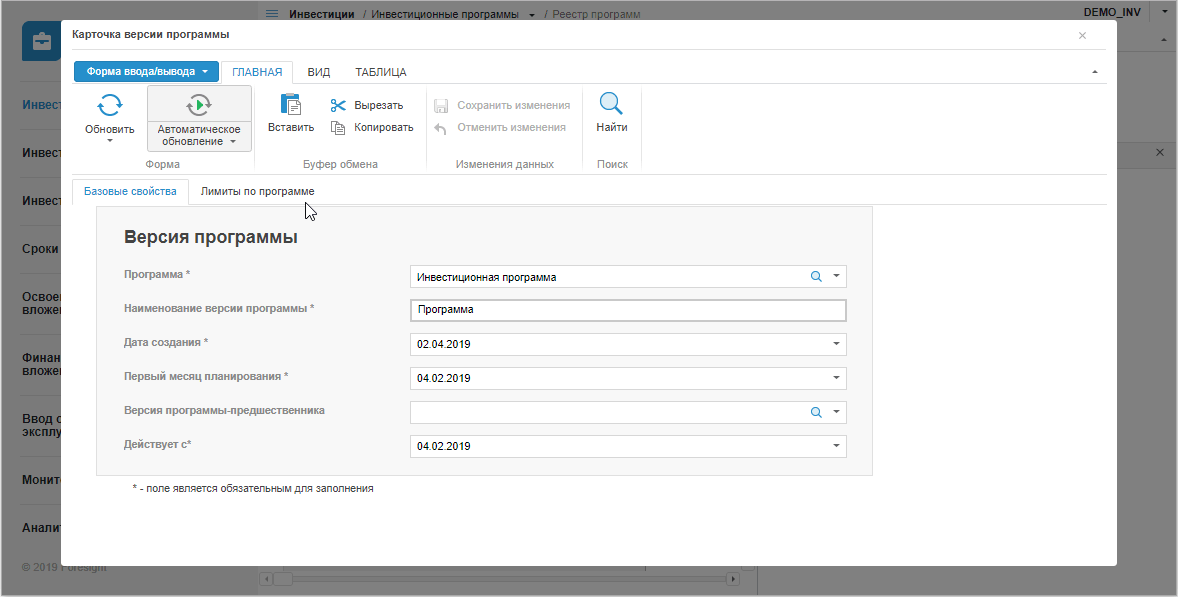 Реестр программ представляет собой интерактивную форму ввода данных, содержащую список версий инвестиционных программ для выбранных типов программ и периодов.
