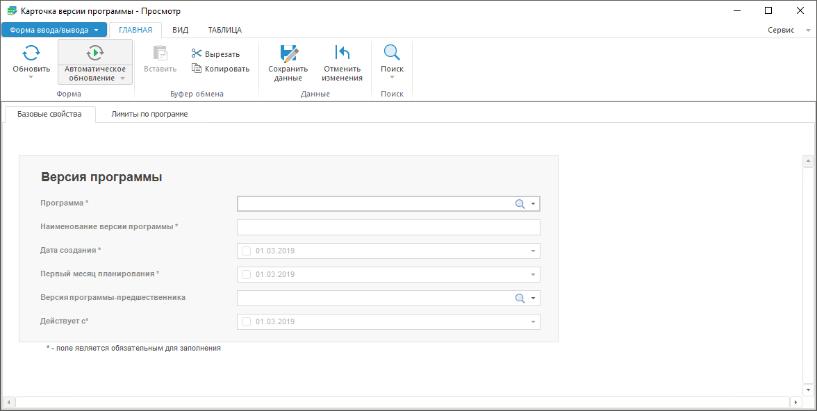 Ввод и редактирование данных по версии программы выполняется в форме «Карточка версии программы».