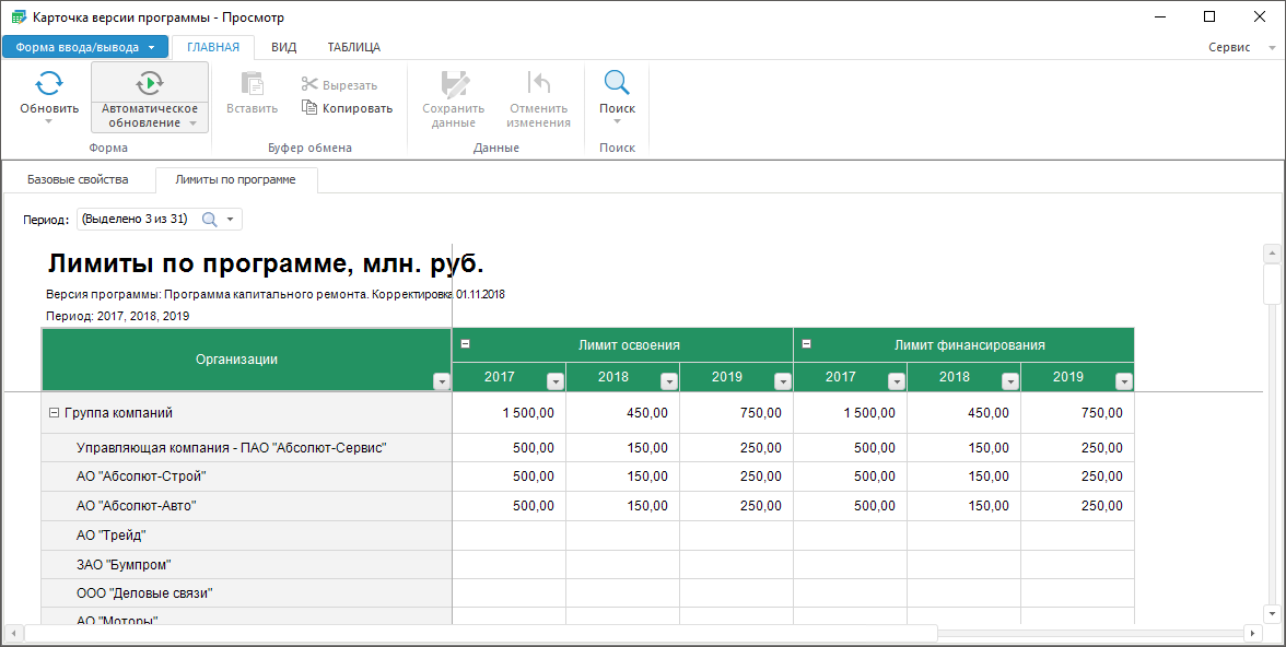 Примечание. При вводе лимитов по версии программы используется двухуровневая организационная структура: группа компаний и входящие в группу дочерние компании.