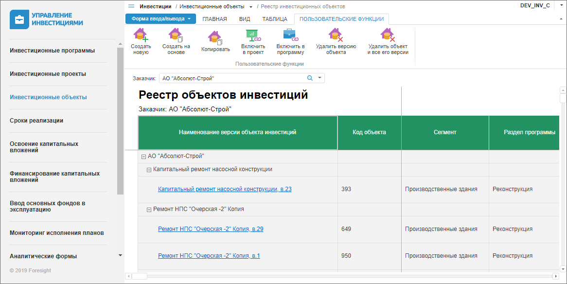 Форма ввода «Реестр объектов инвестиций» предназначена для формирования списка объектов инвестиций и его версий по выбранному заказчику.