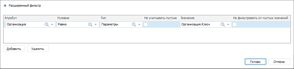 Параметр предназначен для динамического управления данными, отображаемыми в форме ввода. Например, если в качестве параметров реестровой формы выбран справочник «Организация», то изменяя отметку в параметре, в рабочей области формы будут отображаться данные, соответствующие только выбранной организации. В случае параметра с множественной отметкой возможно сформировать реестр по нескольким организациям.