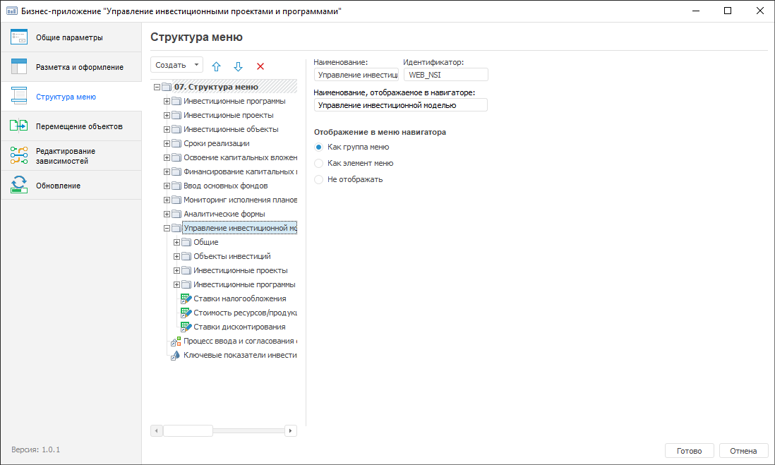 Примечание. Создание структуры и редактирование наименований пунктов бокового меню может выполняться в навигаторе объектов бизнес-приложения в папке «07.Структура меню» стандартными инструментами платформы.