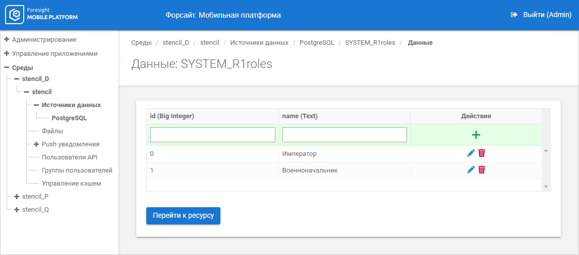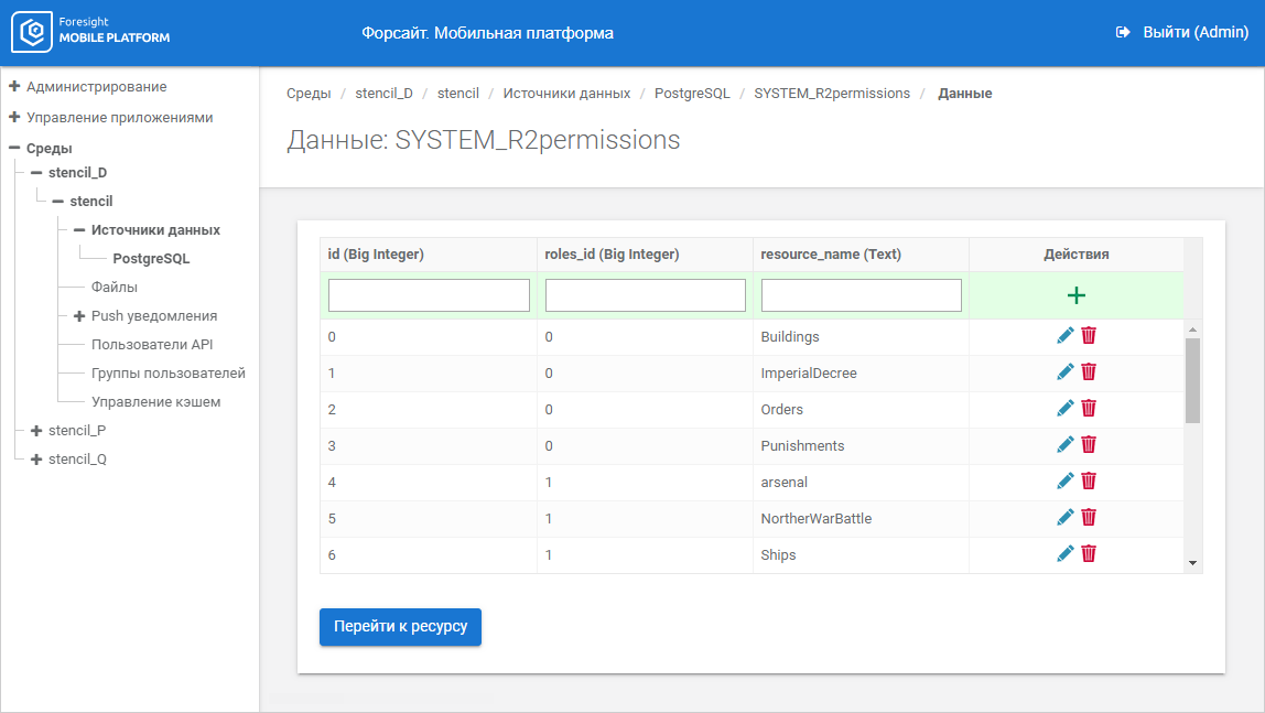SYSTEM_R2permissions. Ресурс содержит таблицу разрешений доступа к ресурсам по ролям. Название ресурса должно соответствовать значению в поле «Название для мобильного клиента» импортированного ресурса;
