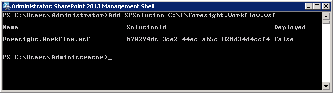После выполнения действий заданное решение будет добавлено в хранилище решений Microsoft SharePoint, в консоли отобразится наименование, идентификатор и статус решения (Deployed: False):