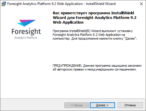Для начала установки запустите файл FP9WebServer.exe. После запуска программа установки проверяет наличие более ранней сборки устанавливаемой версии продукта «Форсайт. Аналитическая платформа» и в случае обнаружения будет предложено обновление продукта «Форсайт. Аналитическая платформа».