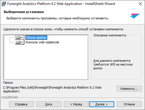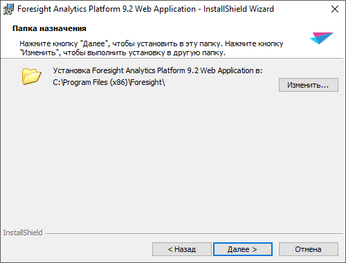 На следующем этапе мастер установки предложит папку, в которую будет установлено веб-приложение «Форсайт. Аналитическая платформа». По умолчанию предлагается папка «C:\Program Files\Foresight\» или «C:\Program Files (x86)\Foresight\» при установке в x64 ОС. Для изменения папки нажмите кнопку «Изменить».