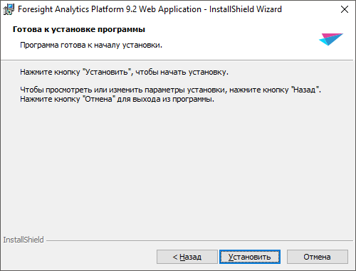 На следующем этапе мастер установки предложит папку, в которую будет установлено веб-приложение «Форсайт. Аналитическая платформа». По умолчанию предлагается папка «C:\Program Files\Foresight\» или «C:\Program Files (x86)\Foresight\» при установке в x64 ОС. Для изменения папки нажмите кнопку «Изменить».