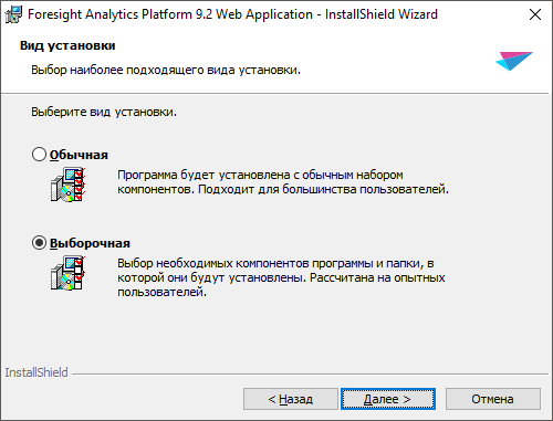 На следующей странице установите переключатель на необходимом типе установки. По умолчанию осуществляется выборочная установка, при этом будет возможность ограничить список устанавливаемых компонентов.