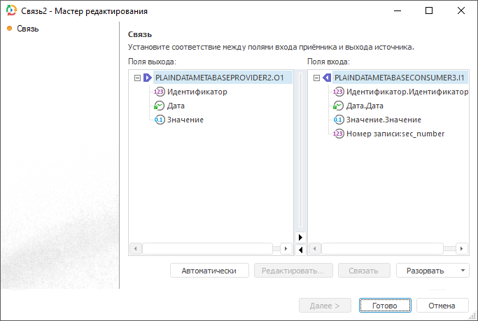 На данной странице устанавливается связи между полями выхода и входа. Действия со связями полей: