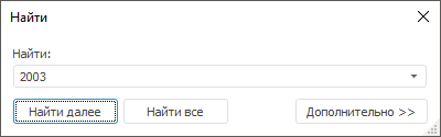 Для поэтапного получения результатов поиска следует нажимать кнопку «Найти далее», фокус будет последовательно перемещаться к найденному элементу. Кнопка «Закрыть» закрывает данный диалог.