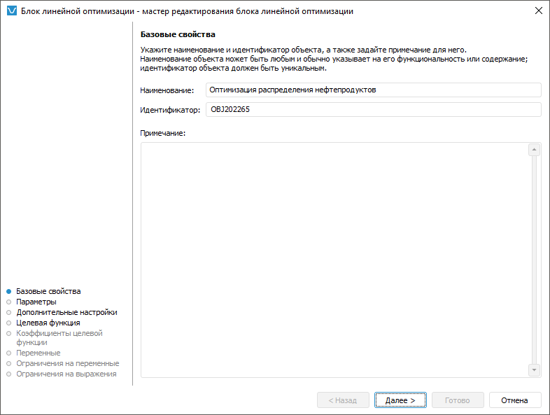 Настройка базовых свойств блока линейной оптимизации выполняется на странице «Базовые свойства» в мастере редактирования блока линейной оптимизации: