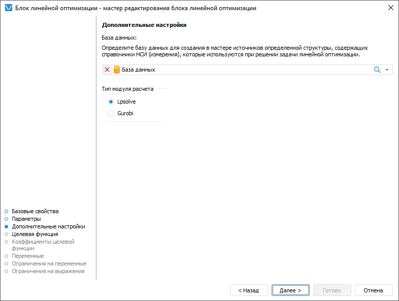Дополнительные параметры позволяют определить базу данных для создания источников, которые используются при решении задачи линейной оптимизации, и выбора модуля расчёта.