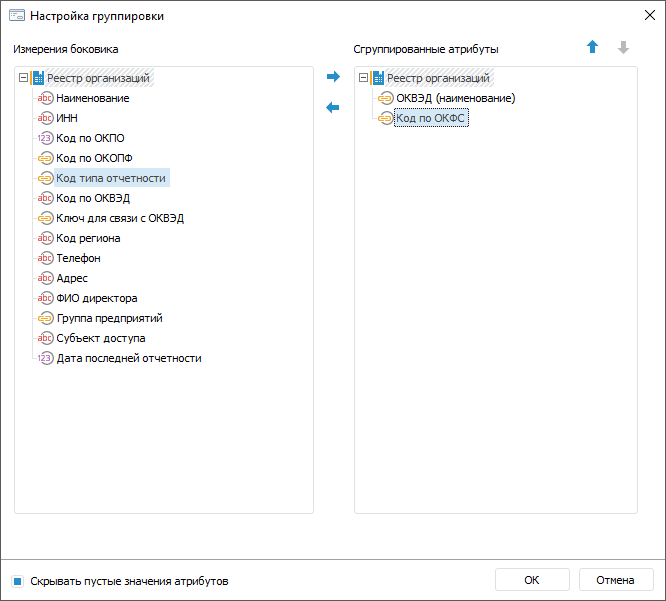 1. Разместите атрибуты в нужном порядке с помощью кнопок и . Расположение атрибутов в области «Сгруппированные атрибуты» влияет на расположение элементов в боковике таблицы. Перемещать можно несколько атрибутов одновременно.
