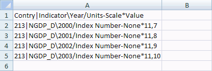 Для выполнения примера предполагается наличие базы данных временных рядов с идентификатором «OBJ_FC» и файла экспорта показателей «C:\Delimited.xlsx». Также в репозитории должен присутствовать репозиторий НСИ с идентификатором «RDS_REPO», в данном репозитории предполагается наличие справочников с идентификаторами «DICT_CTR», «DICT_IND» и «UNITS». В базе данных временных рядов атрибут «COUNTRY» является ссылкой на справочник «DICT_CTR», атрибут «INDICATOR» - ссылкой на справочник «DICT_IND», а единицы измерения ссылаются на справочник «UNITS».