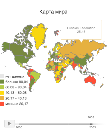 В результате выполнения примера для всех областей корневого слоя карты показаны границы серого цвета толщиной, равной 1 пикселю. Для области слоя карты с идентификатором «RU» была отображена всплывающая подсказка, в которой выведено значение за 2003 год, что соответствует индексу 3: