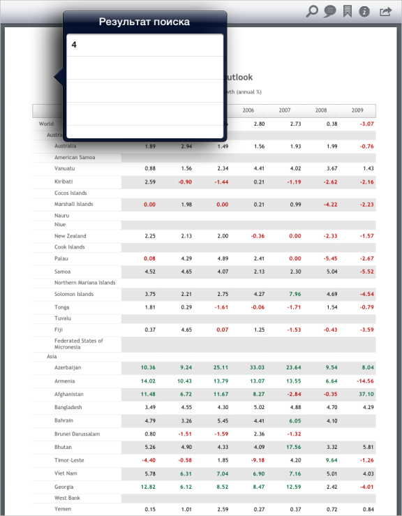 // Создаем представление результатов поиска PdfSearchResultsViewController *searchResultsController = [[PdfSearchResultsViewController alloc] init]; [searchResultsController setContentSizeForViewInPopover:CGSizeMake(300.0, 200.0)]; // Задаем для представления результатов поиска делегат просмотрщика документов [searchResultsController setDelegate:dataViewController]; // Создаем всплывающее окно UINavigationController *navController =[[[UINavigationController alloc] initWithRootViewController: searchResultsController] autorelease]; UIPopoverController *popoverController = [[UIPopoverController alloc] initWithContentViewController:navController]; popoverController.delegate = dataViewController; // Устанавливаем делегат поиска в просмотрщике регламентных отчетов [reportDataViewControllerBase setSearchDelegate:searchResultsController]; // Устанавливаем признак того, находится ли просмотрщик в режиме поиска [reportDataViewControllerBase setInSearching:YES]; // Осуществляем поиск заданной строки в регламентном отчете [reportDataViewControllerBase searchText: @"Togo"]; // Отображаем всплывающее окно [popoverController presentPopoverFromRect:CGRectMake(100, 100, 1, 1) inView:[dataViewController pdfView].scrollView permittedArrowDirections:UIPopoverArrowDirectionAny animated:YES];