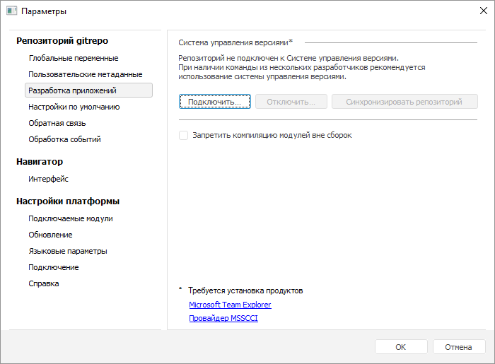 Примечание. Пользователи, компьютеры которых не были настроены на работу с системой управления версиями, будут использовать версии объектов, хранящихся в репозитории. При этом вкладка «Разработка приложений» в окне «Параметры» будет принимать вид аналогично виду вкладки после подключения репозитория к системе управления версиями.