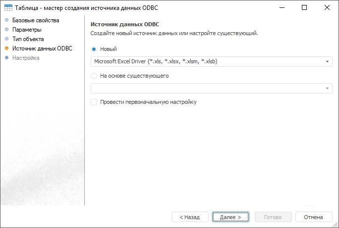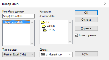 Рассмотрим пример подключения к XLS-файлу с помощью объекта «Источник данных ODBC».