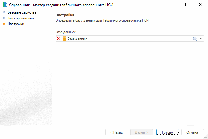 Мастер табличного справочника НСИ содержит ряд базовых страниц, описание которых представлено в разделе «Работа с мастерами» и страницу «Настройки»: