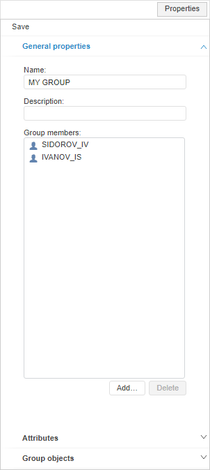 To add and delete users included into the group, use the Group Members tab in the Group Properties desktop application dialog box and on the Properties web application side panel: