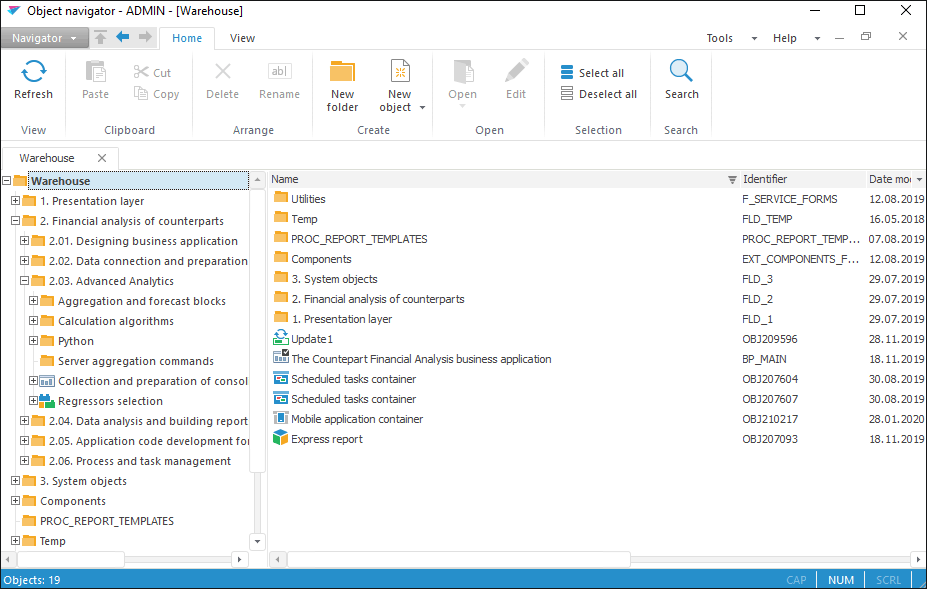 A repository object is an object having a special set of characteristics and specific structure and usage. In Foresight Analytics Platform objects are used for working with separate data types or executing typical tasks. Object examples are tables, dictionaries, cubes, reports, and so on.