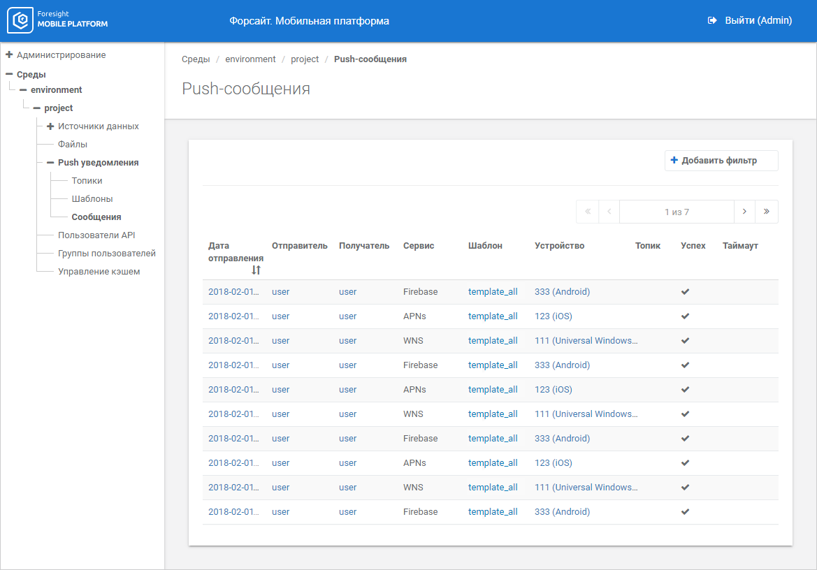 Successful sending of push notifications as flags, if a message is delivered to the service and received by it as a correct one.