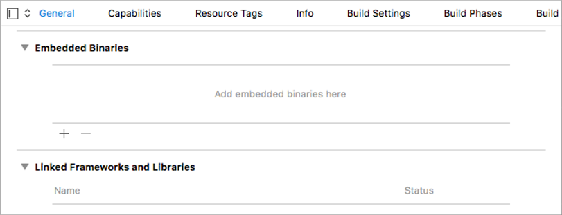 Open project file with the *.xcodeproj extension on the General tab in the Embedded Binaries section using the + button.
