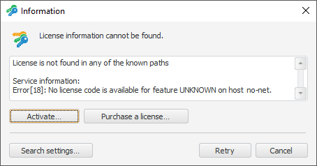 Search Settings. Opens a dialog box with license search settings, after closing this dialog box, the system tries to find the license taking into account the made changes.