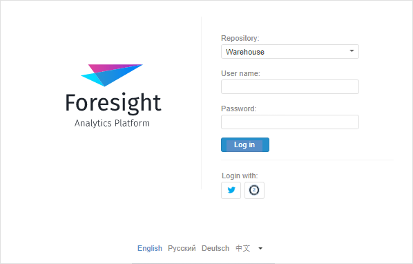 Select the repository and click the button of any authorization services without entering user name and password. After that navigation to the account page of corresponding service, for example, Twitter or Google, will be executed. Enter user name and password on the service page and click the Log In button. After successful login, the web application start page opens.