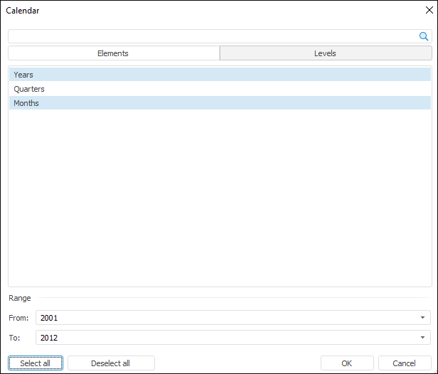 When the calendar dimension displaying mode By Elements and Levels is active, the dialog box can look as follows: