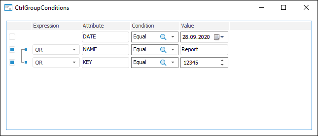 By default, the components contains two columns that cannot be deleted. The first column displays checkboxes for selecting elements and created groups of elements. The second column displays the expressions that determine join statements for elements in group. To get component columns, use the IListView.Columns property.