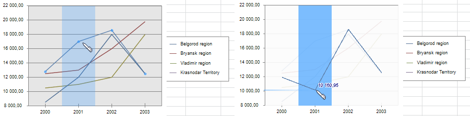 After enabling this editing mode, select the series to edit in the legend. Points of this series become selected in the chart. On hovering over the chart the mouse cursor changes to a pen, and the area that contains the point, is highlighted with color. Hold down the left mouse button and change values of series points step by step. New value appears next to the dragged point: