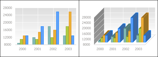 Histogram shows value of each element as a horizontal or vertical column, which length is proportional to the element value. Each data group has individual set of columns on the chart, each data series is marked with specific color specified in the legend.