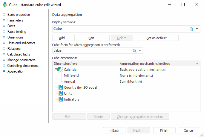 This page is used to set up display versions and aggregation for cube dimensions. A detailed description of setting up various aggregation mechanisms is given in the Aggregation by Dimension Levels section. Disaggregated data is extracted on opening the cube. Data is aggregated in the opened cube in the client workstation.