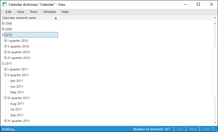 Such a dictionary supports the following levels of detailing (frequency): annual, 9 months, semi-annual, quarterly, monthly, weekly, and daily. Its contents is generated automatically depending on the specified parameters.