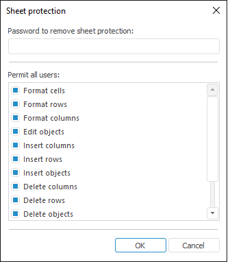 In the dialog box that opens, select the operations the user can execute with a sheet. Select a checkbox to enable the operation. All checkboxes are selected by default. Deselect a checkbox to prohibit an action.